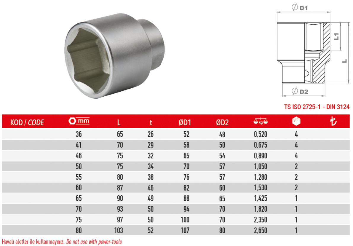 - Kare adaptörü TS ISO 1174 - DIN 3120-D 25’e uygun,