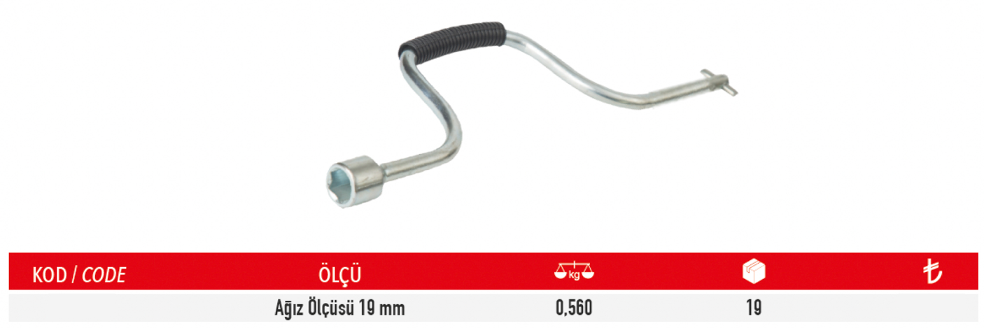 - Araba krikosunu kaldırmak için özel formda tasarlanmış ürün. Bir ucu 19 mm ölçüsünde altıköşe ağızlı.